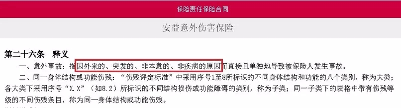 注意:在意外伤害保险中,人身伤害必须是意外事故造成的。在正规保险公司的保险合同上,对意外事故有明确定义:因外来的、突发的、非本意的、非疾病的原因直接且单独地导致被保险人发生事故。
