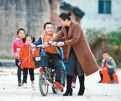 12月5日,在广西永福县良村的“儿童之家”,妇联干部教孩子骑单车。