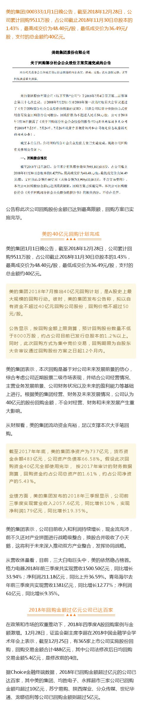 (原标题:史上最大规模!美的集团40亿回购实施完毕,2018年回购金额过亿元公司已达百家)