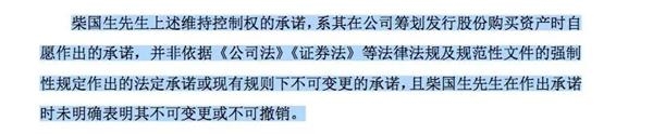 而如此变更承诺后,柴国生关于维持控制权的承诺期限则只需履行至2018年9月。也就是说,柴国生9月份之后已不再需要履行上述承诺,然而其却在2018年12月份才提请变更承诺,看上去似乎已没有实际意义。