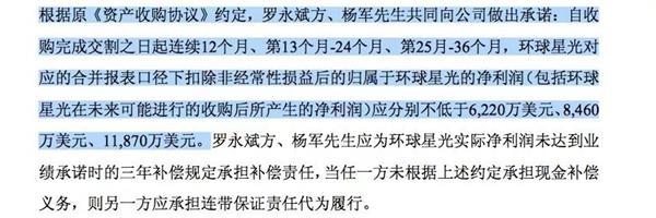 彼时,公司与交易对方就环球星光三年业绩承诺进行约定,若环球星光的实际净利润未达到承诺的净利润, 则罗永斌与Oneworld Star Holdings Limited(下称:“罗永斌方”)、杨军应根据约定向公司做出业绩补偿。