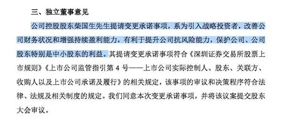 不过,独立董事的意见中似乎透露了变更承诺背后的隐情:系为引入战略投资者。
