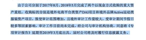 商赢环球给出的原因是,审计工作量大,将延期至2019年3月底出具审计报告。