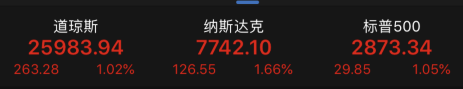 截至收盘,标普500指数涨29.85点,涨幅1.05%,报2873.34点。道琼斯工业平均指数收涨263.28点,涨幅1.02%,报25983.94点。纳斯达克综合指数收涨126.55点,涨幅1.66%,报7742.10点。