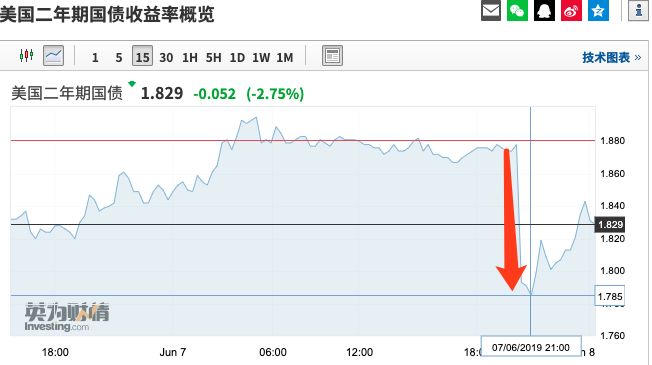 对利率前景敏感的2年期美国国债收益率一度降至1.77%,接近今年以来最低水平: