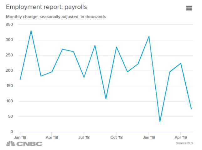 美国劳工部周五公布的数据显示,5月份美国的就业增长急剧放缓,非农就业人数仅增加7.5万人,远远低于预期的18万人和前值的22.4万人(修正后)。此外,7.5万人的增幅不仅是过去四个月以来美国的就业人数第二次下降,更是创下了过去9年来的最小值。