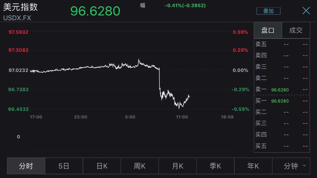 美元指数则短线跳水近40点,跌破97整数关口: