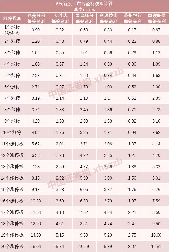 丸美股份、大胜达、景津环保、科瑞技术、苏州银行、国联股份,6只新股上市后,如果能达到今年以来上市新股的平均水平——7个涨停板的话,则每签获利分别约为3.19万元、1.14万元、2.1万元、1.17万元、0.61万元、2.35万元。