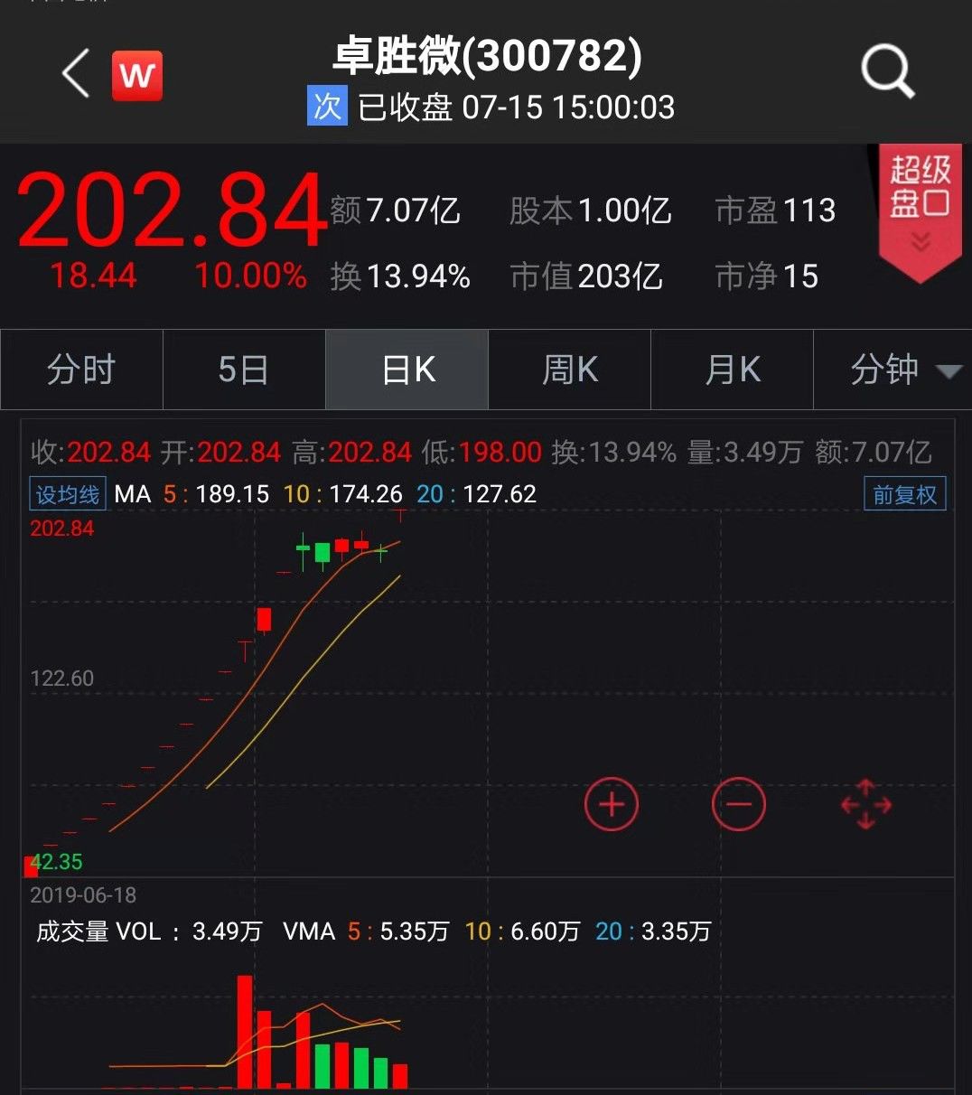 值得一提的是,6月18日在创业板上市的卓胜微,连续收获了11个一字涨停板,每签获利为53840元,成为今年打新最赚钱的新股。7月5日,卓胜微股价达到175.42元,超越迈瑞医疗成为创业板新的股价之王。7月15日,卓胜微股价突破200元,达到202.84元,在全部A股中排名第4,仅次于贵州茅台(975.93元)、长春高新(331.38元)、吉比特(213.35元)。上市仅仅20天,卓胜微的股价涨幅已达474.78%,中一签500股,每签盈利达到83775元。