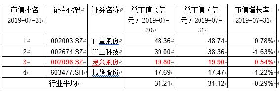 截至7月31日收盘,浔兴股份市值近20亿元,位列行业第三,今日市值增长0.54%,高于行业平均-0.29%的涨幅。行业内上市公司市值变化情况明细: