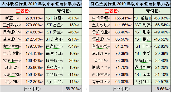 从行业分类横向比较来看,市值增长两个行业平均市值超过了50%,最高的行业为农林牧渔行业,增长率为58.79%,另一个行业是食品饮料行业,增长率为50.43%。行业平均市值负增长的共有三个行业:钢铁行业、银行以及建筑装饰行业,其中,钢铁行业市值平均缩水0.97%。