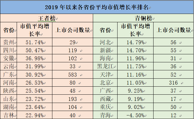 从地域层面横向比较,市值增长超过50%的有贵州和四川两个省份,市值增长率分别为51.74%和50.47%。市值平均增长排名末位的有三个省份:西藏、重庆以及青海,其中仅青海地区的市值负增长,降幅为4.50%。