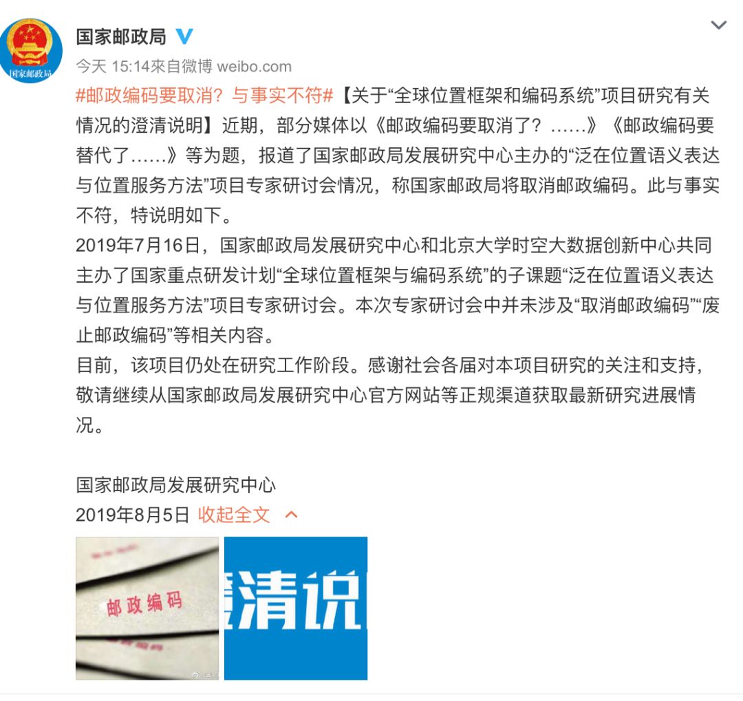 六位数邮编将被取消?国家邮政局官方辟谣:报道与事实不符。