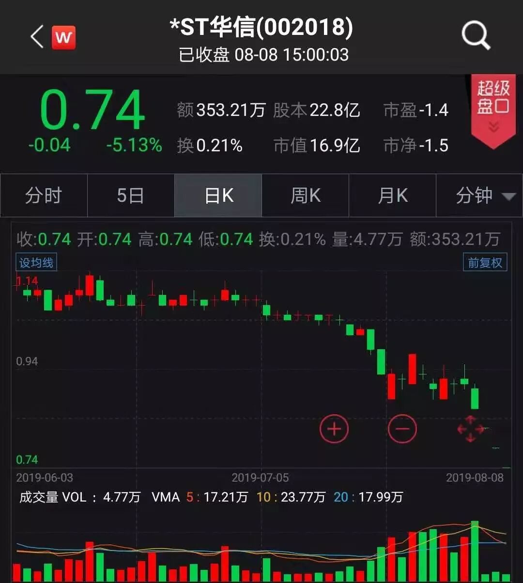 8月8日是近期*ST华信收盘价连续低于1元的第14个交易日。如果单纯按*ST股5%的涨幅限制计算,在接下来的6个交易日里,公司股价即使全部涨停,最终的价格也不会超过1元。(即:0.74元*1.05*1.05*1.05*1.05*1.05*1.05=0.991元)
