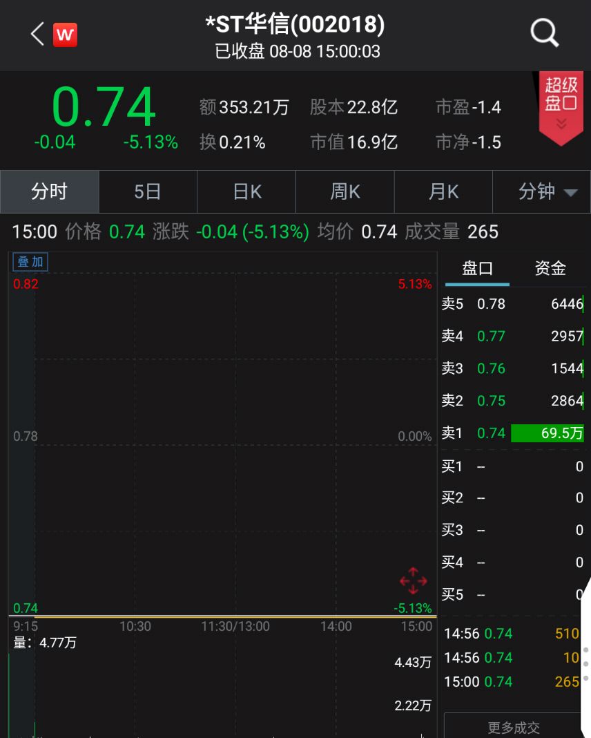 8月8日收盘,*ST华信一字跌停,股价报收0.74元,连续14个交易日收盘价在1元以下。从交易情况来看,Wind统计数据显示,该股全天成交量有4.77万手,总金额约353万元,换手率仅为0.21%,全天成交惨淡。