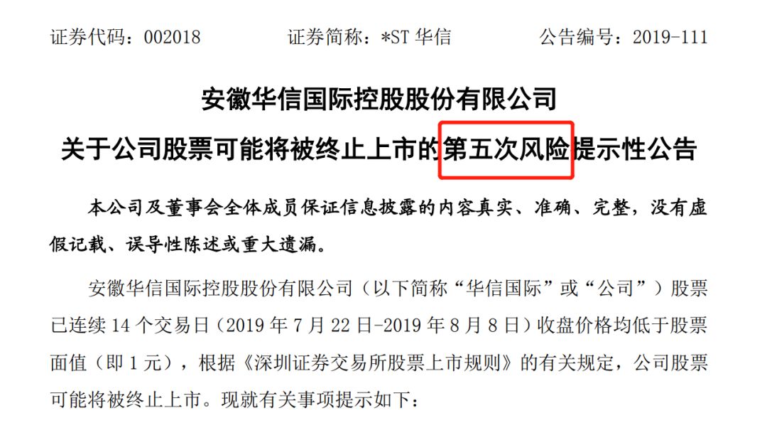 按照沪深交易所相关上市管理规定,如果公司股价连续20个交易日收盘价低于1元,那么公司股票将会触及“面值退市”红线,交易所将对股票采取强制退市处理。为此,8月8日晚,*ST华信近期第五次提示终止上市风险。