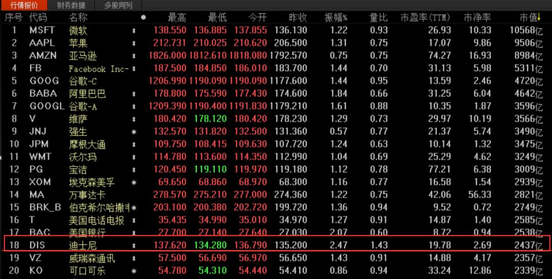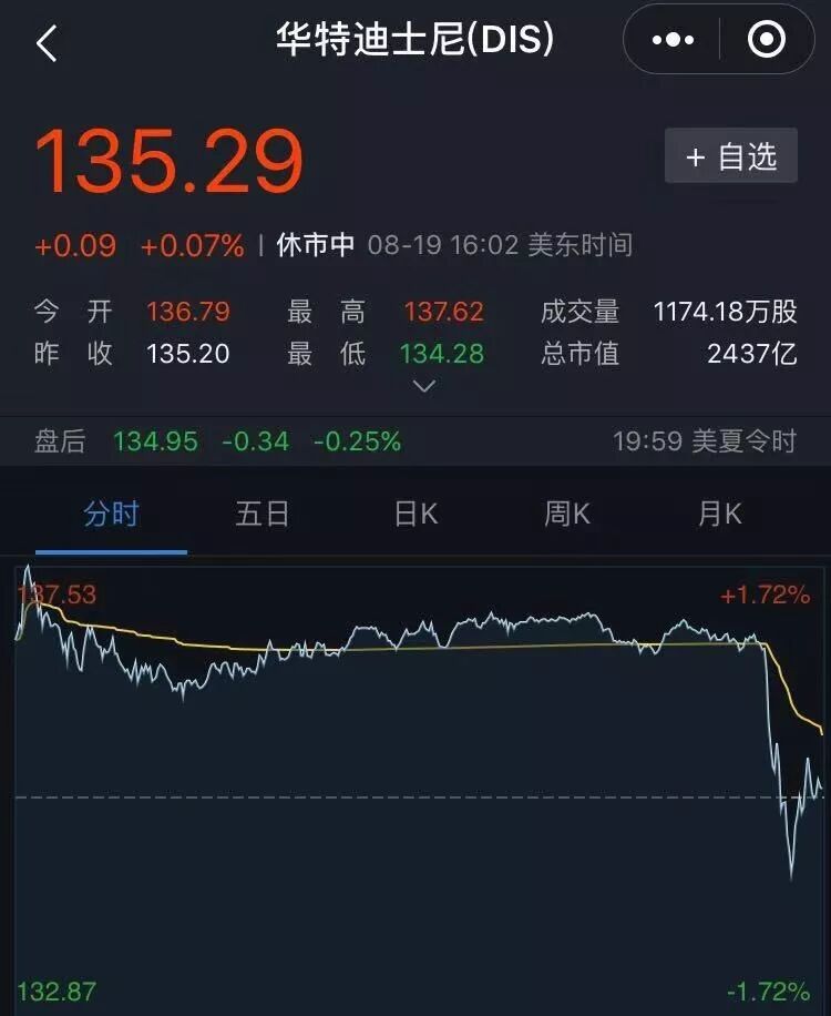 截至收盘,迪士尼涨幅缩窄至0.07%,报135.290美元/股,总市值为2437亿美元。