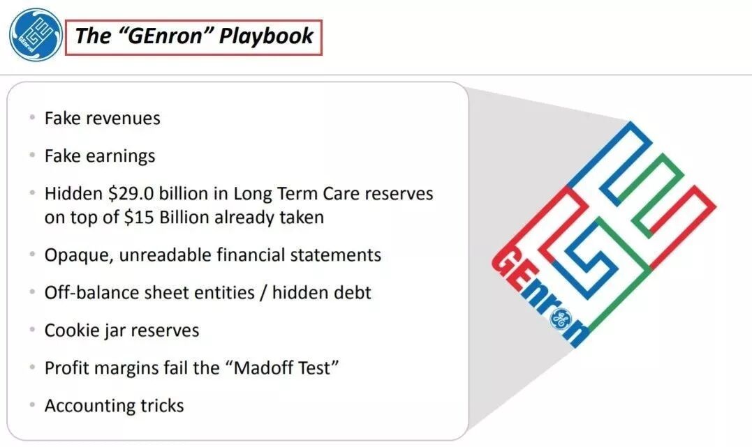在Markopolos看来,“GE利用了许多与安然公司相同的会计技巧,以至于把它称为GEnron剧本”,“我的团队过去7个月一直在分析通用电气的会计账目,我们认为所遇到的380亿美元欺诈案只是冰山一角”。