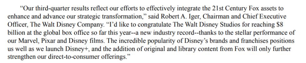披露2019年第三季报时,“第三季度业绩反映了我们有效整合21世纪福克斯资产以加强和推进公司战略转型的努力,”迪士尼董事长兼首席执行官Robert A.Iger说,“今年迪士尼工作室的全球票房收入已经达到了80亿美元,打破了记录,这主要得益于漫威、皮克斯和迪士尼电影的出色表现。”