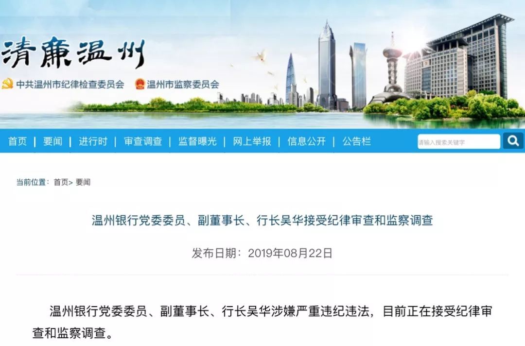 8月22日晚间,中共温州市纪委检查委员会、温州市监察委员会官网“清廉温州”公告,温州银行党委委员、副董事长、行长吴华接受纪律审查和监察调查。