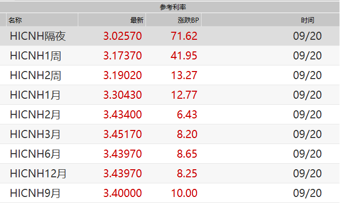 上图为,国内上海银行间拆借利率报价。对比来看,9月20日,香港人民币Hibor隔夜利率报3.025%,较当日国内隔夜Shibor高出27.9个基点。