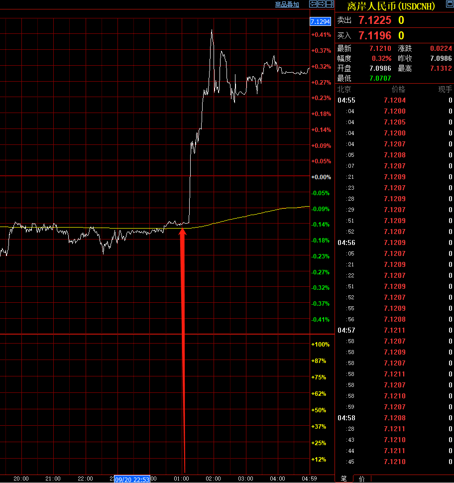 事实也证明,央行预判非常靠前。在北京时间9月21日1点开始,离岸人民币出现大幅贬值,从7.0892在一个小时间内下跌到7.1291,贬值近400点。当时美国东部时间在下午交易时段,而国内已经闭市。