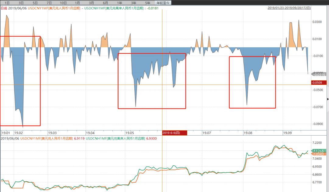 上图为,在岸人民币(CNY)和离岸人民币(CNH)一个月远期价差图。从上图来看,USD/CNY与USD/CNH的价差,即负值扩大,说明海外看空人民币热情较高。同样在,看空高涨的负值区间,红框区间也为央票在香港发行的时间区域。