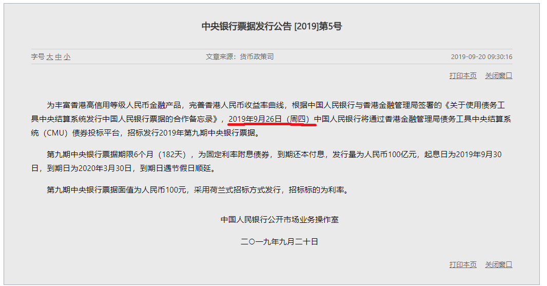 根据央行9月20日发布消息,央行将于9月26日通过香港金融管理局债务工具中央结算系统(CMU)债券投标平台,招标发行2019年第九期中央银行票据,总额为100亿元。