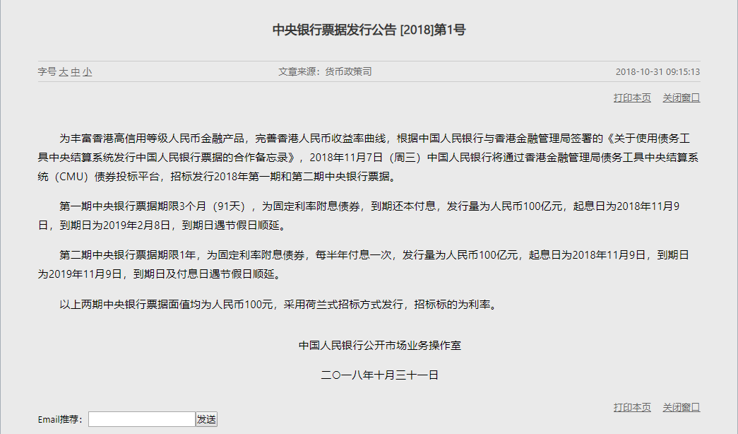 2018年当年,央行在香港发行两期期央行票据。2018年11月9日,在香港发行规模为200亿元的央行票据。