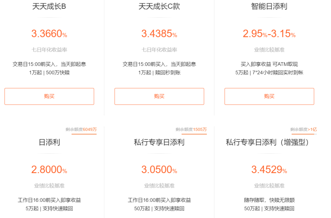 当然,从日常理财的角度看,一些银行的活期理财产品和定期理财产品也是不错的选择。其中,一些活期理财产品在工作日15:00前买入即可当天享受收益,同时支持在交易时间08:30-15:00实时赎回无限额。这些产品的七日年化收益率或者业绩比较基准,有时比普通货币基金更有吸引力。