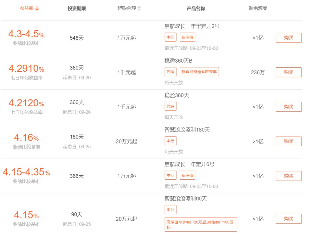 定期理财方面,相关产品的业绩比较基准或七日年化收益率基本都在5%以内。