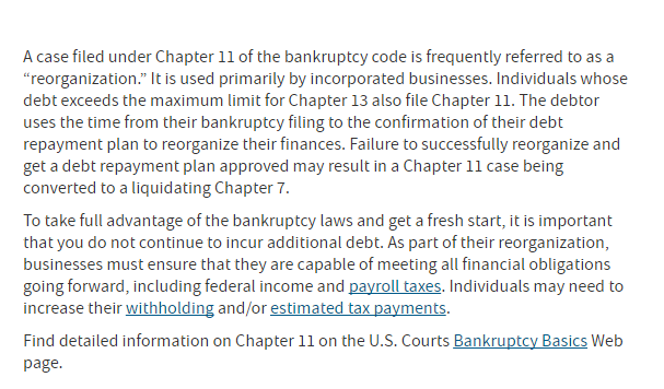 破产重组(Chapter 11)是指企业或个人当下资不抵债的情况下,法律允许债务人向债权人提出一个重组方案,以某种资产保障的方式延期偿还。