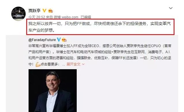 今年9月3日,贾跃亭在微博上宣布一则重磅消息:法拉第未来正式宣布任命毕福康博士为全球CEO。同时,法拉第未来创始人贾跃亭将辞去原CEO职务,出任CPUO(首席产品和用户官,Chief Product & User Officer),将负责互联网生态系统战略的整体落实,领导人工智能、产品定义等相关工作。