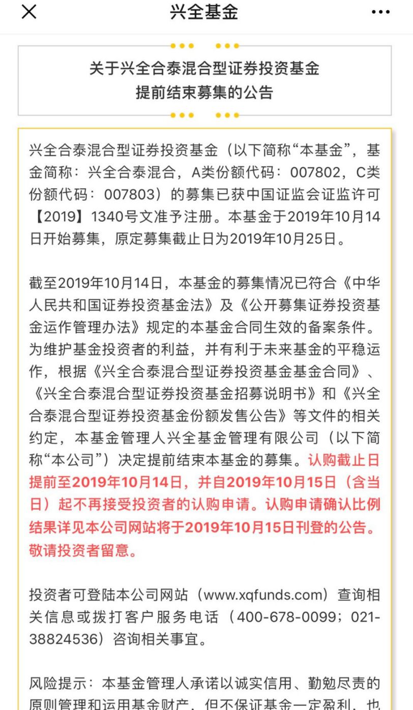 又见爆款基金,兴全合泰混合型基金认购规模突破300亿。截至10月14日下午3点,兴全基金旗下第16只权益新基——兴全合泰的认购规模已突破300亿元,由于该产品的募集规模上限为60亿元,将提前结束募集并启动比例配售。