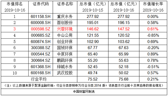 截至10月16日收盘,兴蓉环境市值近148亿元,位列行业第三,今日市值增长0.61%,行业平均上涨0.21%。下表是行业内上市公司市值变化情况明细: