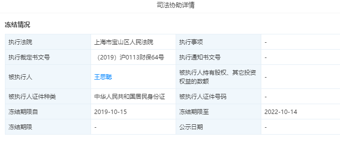 • 王思聪多家公司股权遭冻结。据“天眼查”显示,近日由王思聪担任董事长并持股100%的北京普思投资有限公司(简称“普思资本”)股权遭到上海市宝山区人民法院冻结,具体冻结数额不详,冻结日期自2019年10月15日起至2022年10月14日。延伸>>除了普思资本的股权被冻结,王思聪投资的多家公司也麻烦缠身。普思资本所投的两家公司,九好网络科技集团有限公司、乐视体育文化产业发展(北京)有限公司均为最高人民法院所公示的失信公司。