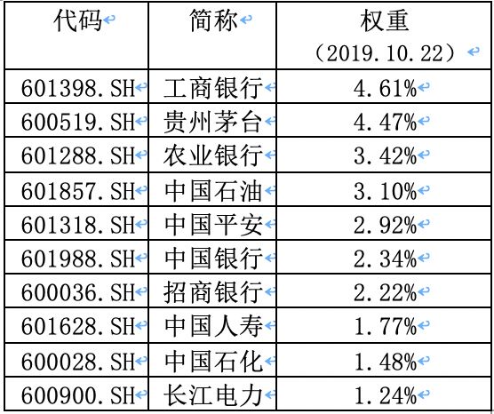 上证综指前十大市值权重股占比达到了27.57%。据海通策略研究发现, 2009年10月16日,上证综指前10大权重股(主要是石油石化和金融企业)在其成分股中市值权重占49.6%,仅中国石油、中国石化合计占比已达17%。现在,中国石油和中国石化的合计占比为4.58%。