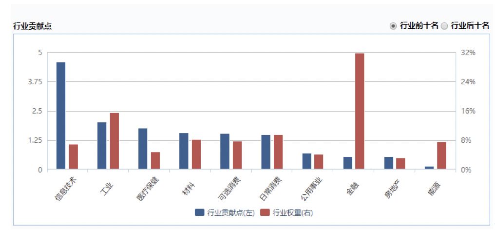 令人惊讶的是,行业贡献点最高的是信息技术,其在行业权重占比却不到8%。