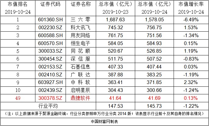 截至10月24日收盘,鼎捷软件市值近42亿元,位列行业第49,今日市值增长0.13%,行业平均下挫1.22%。下表是行业内上市公司市值变化情况明细: