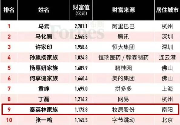 这位河南千亿首富是A股上市公司牧原股份创始人秦英林。昨日发布的福布斯2019年度中国富豪榜,秦英林排名第九位。