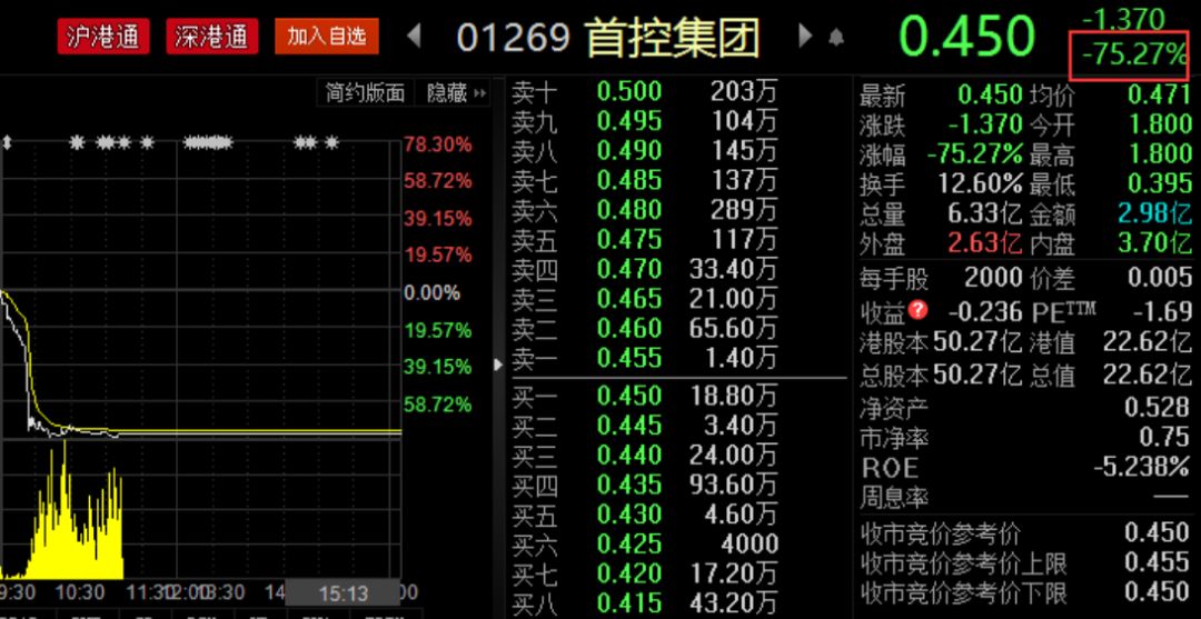 截至临时停牌前,首控集团跌幅为75.27%,报0.45港元/股,最新市值22.62亿港元。
