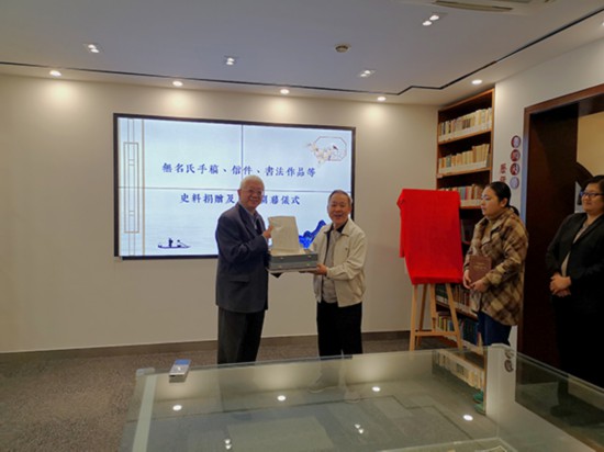 11月29日,无名氏好友、台湾文史哲出版社社长彭正雄(右)将所藏无名氏文献资料全部捐赠给复旦大学图书馆特藏中心。左为复旦大学图书馆馆长陈思和。 本文图片均由澎湃新闻记者 罗昕 摄
