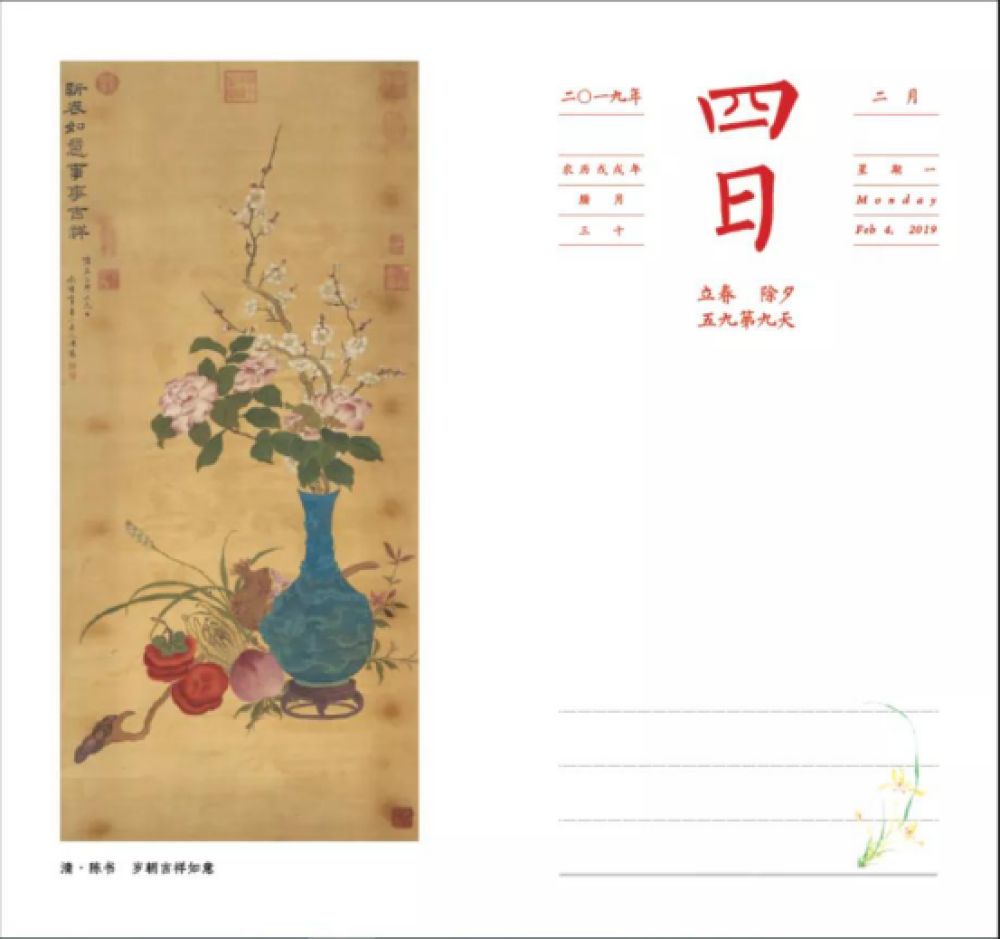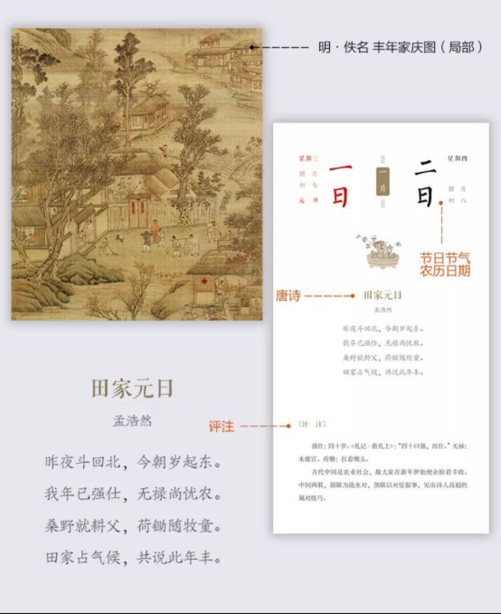 与往年“一日一诗,一日一画”设计不同的是,2020年这本日历内文,左页依旧是传世名画,但诗、评注、日期都集中在右页,使版式更为饱满、紧凑,诗画同览,更得“诗情画意”之精髓。