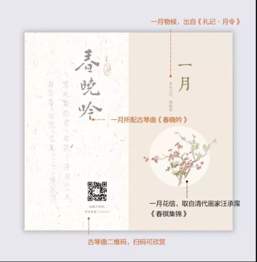 12张月份页,左页是当月古琴曲的琴谱,可以扫描二维码欣赏,右页取《礼记·月令》中的一句,并搭配清代汪承霈《春祺集锦》中的花草,以提示当下物候。