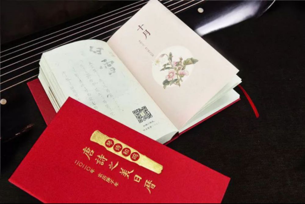 “琴诗和鸣”四个小字,下衬一架“灵机式”古琴剪影,烫金的凹凸感非常明显,摸着“古琴”上那四个小圆圈,好像在触摸真正古琴上的螺钿琴徵,让人产生“换羽移宫”的冲动。