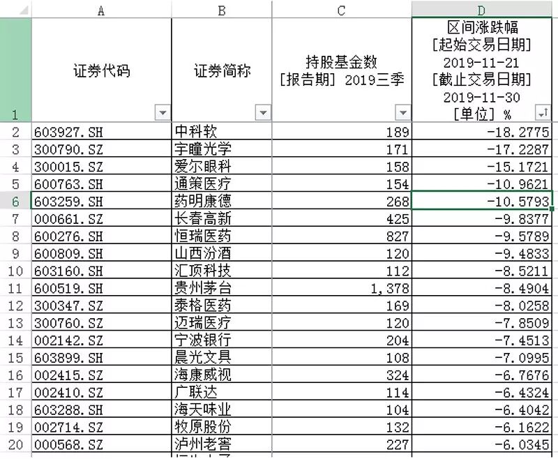 部分基金重仓股11月21日至11月30日跌幅如图: