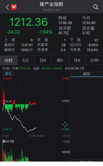 9、10月份,相关公司股价与猪价一度同频共振,一路走升。不过,随着各项增加猪肉供给的政策出台,对冲供给缺口,相关股价也随之调整。Wind数据显示,今天开盘以来,截至12:16,猪产业指数跌1.94%,相关股票一片绿色。
