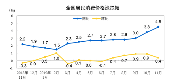 上午,国家统计局公布数据显示,11月CPI同比上涨4.5%,涨幅比上月扩大0.7个百分点,猪肉价格同比上涨了110.2%。不过,这种上涨趋势已经出现缓解兆头。