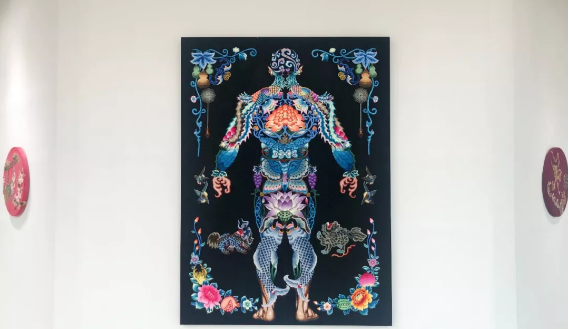 郭鹿鸣的作品,把着眼点放在这种制作门帘图案的传统工艺——“扎剪绒绣”上。在历史长河的冲刷下,在一双双民间巧手的劳作中,承载了中国传统文化的经典图式以一种新的面貌在冀南大地上再一次被声情并茂地传唱着。“扎剪绒绣”正是在这个过程中走向了成熟。今天,TA以鲜明的布面浮雕式的艺术语言出现在我们的视野中,这一点也成为TA区别于其他刺绣样式的最大特点。我把这些饱含中国传统文化基因与精神力量的传统图案看作是肌体的营养,重新构建出一个饱满的人形——TA背靠着传统,面向着未来!