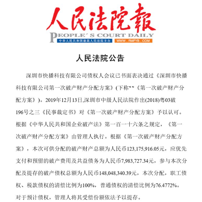 1月2日,人民法院公告网显示,最高人民法院在2018年12月29日刊登公告称,深圳市快播科技有限公司债权人会议已书面表决通过《深圳市快播科技有限公司第一次破产财产分配方案》。公告显示,2019年12月13日,深圳市中级人民法院对《第一次破产财产分配方案》予以认可。根据《中华人民共和国企业破产法》第一百一十六条规定,《第一次破产财产分配方案》由管理人执行。